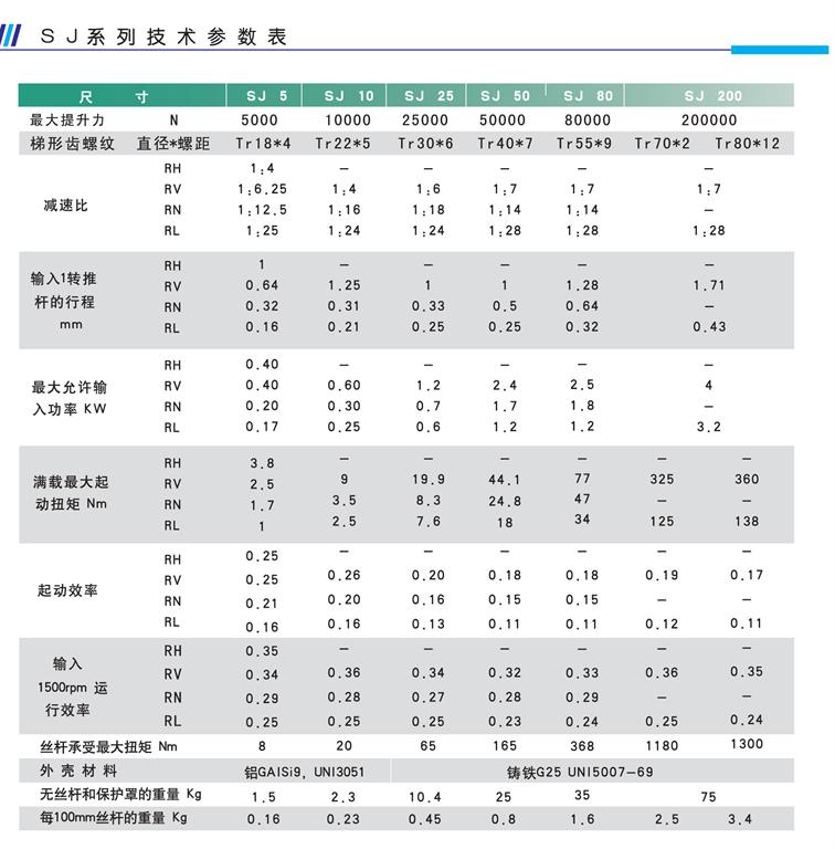 SJ系列升降機有_的設計,緊湊的箱體,比MA系列價格更低,工作制也低。MA系列齒輪箱體設計更適合于重負載、高工作制的場合。SJ系列的負載范圍在0.5噸~20噸之間,推桿線速度_快可達到30mm/s,輸入速度_為1500r/min;輸入形式多樣,10分鐘的工作制為20%,工作環境溫度為-10℃~70℃;而MA系列的負載_可達到35噸,輸入速度更是_達到3000r/min,可提供雙頭三頭絲桿和滾珠絲桿;附件配置多:限位開關,防塵罩,安全螺母,防反轉裝置。10分鐘的工作制為30%(環境溫度為-10℃~70℃)。