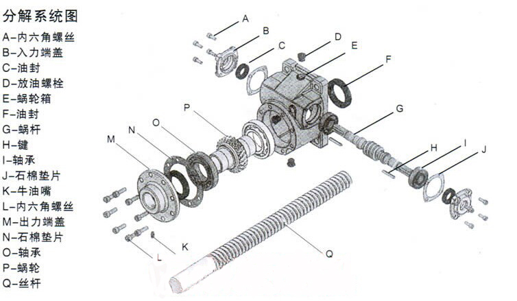 蝸輪絲桿升降機蝸輪采用國標9-4銅蝸桿材質為40Cr,絲桿一般采用45#鋼,也可根據用戶特殊需要定制不銹鋼絲杠。絲桿升降機蝸桿和絲杠都_經特殊熱處理及蝸桿磨磨制。