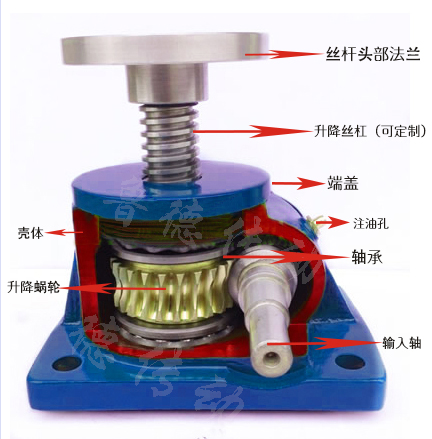 蝸輪絲桿升降機原理是電機帶動蝸桿轉動,利用蝸輪蝸桿的傳動,使蝸輪旋轉,蝸輪中心是內螺紋結構,相當于升降絲桿的螺母,和升降絲桿相匹配,與絲桿配合,蝸輪旋轉帶動絲桿做軸向運動。