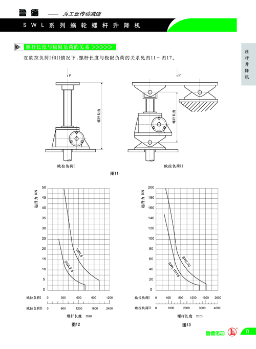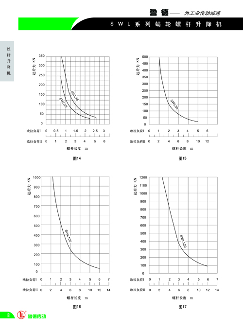 上圖給出了允許彎曲力矩下,螺桿的長(zhǎng)度與_負(fù)荷的關(guān)系。根據(jù)螺桿的行程和起升負(fù)荷,查出所需升降機(jī)的型號(hào),再根據(jù)查出的升降機(jī)型號(hào)和起升負(fù)荷查出蝸輪絲桿升降機(jī)的在不同起升負(fù)荷下允許的起升速度,若查出的起升速度滿足不了要求,則須選用型號(hào)大一規(guī)格的升降機(jī),直至滿足要求。