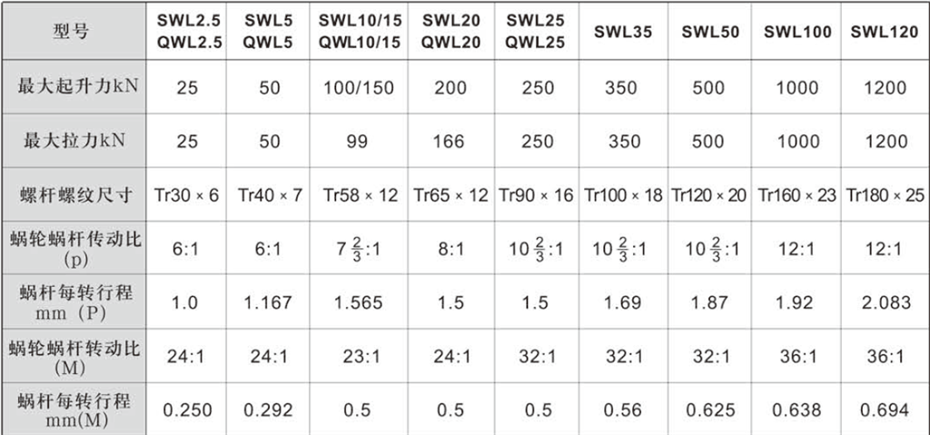 SWL蝸輪絲桿升降機有慢速(M)和普通(P)速比兩種,慢速1:24,每分鐘行程400mm;普通1:6,每分鐘行程1670mm。