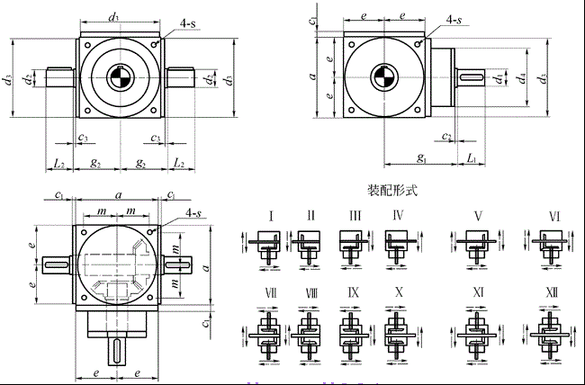 注: a、軸d2可作為輸入端,此時,SPL型換向器在許用速度范圍內可作增速傳動 b、如果數只換向器串連使用,建議_SPV型 c、訂貨時,請指明地腳螺紋孔位置 |