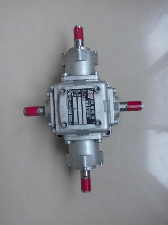 ,雙輸入軸,雙輸出軸,內(nèi)部有兩對(duì)傘齒輪,雙脖子的輸入方向相反,中間通軸的輸出方向相同。