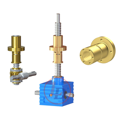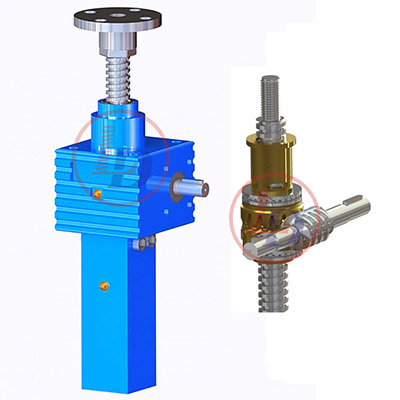 絲桿升降機的主要組成部分之一是蝸輪蝸桿,一般蝸輪(即螺母)都是銅塊車制而成,蝸輪與絲桿為內螺紋連接或者鍵連接,從而把絲桿升降機劃分成兩種結構形式,絲桿運動型和螺母運動型。